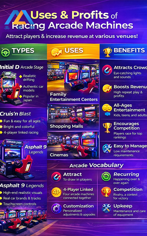 Racing games have consistently proven to be one of the most popular categories in amusement venues. This machine combines classic racing gameplay with modern design, immersive controls, and advanced lighting effects, making it appealing to a wide range of players—from casual gamers to hardcore racing fans.